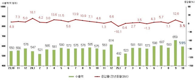 산업통상자원부는 2025년 10월 수출이 전년 동월 대비 3.5% 증가한 595억 달러를 기록해 5개월 연속 증가세를 이어갔으며, 수입은 1.5% 감소한 535억 달러로 무역수지는 60억 달러 흑자를 달성했다고 17일 밝혔다.