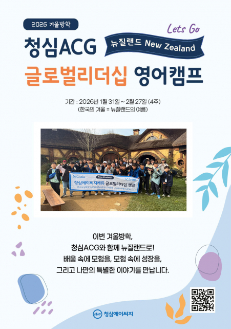 청심ACG는 오는 2026년 1월 31일부터 2월 27일까지 4주간 만 10세에서 만 14세까지의 학생을 대상으로 뉴질랜드 오클랜드에서 ‘배움 속에 모험을, 모험 속에 성장을, 그리고 나만의 특별한 이야기를 만난다’를 주제로 영어 캠프를 진행한다.