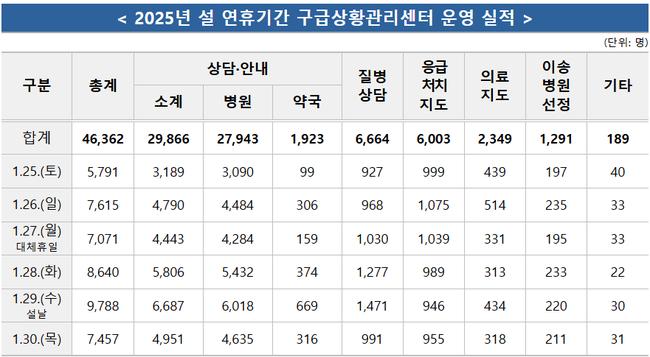 내용별로는 병원·약국 안내가 2만9866건(64.4%)으로 가장 큰 비중을 차지했고, 질병 상담 6664건, 응급처치 지도 6003건이 뒤를 이었다. 연휴 기간 문을 여는 의료기관을 찾지 못해 119에 문의하는 사례가 집중된 것으로 분석된다.