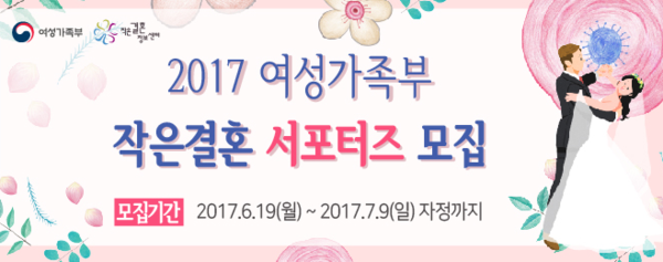여성가족부가 2030세대가 직접 작은결혼 관련 홍보콘텐츠를 제작하고 확산시켜 나가는 ‘2017 작은결혼 서포터즈’를 발족하기로 하고 7월 9일(일)까지 지원자를 모집한다.